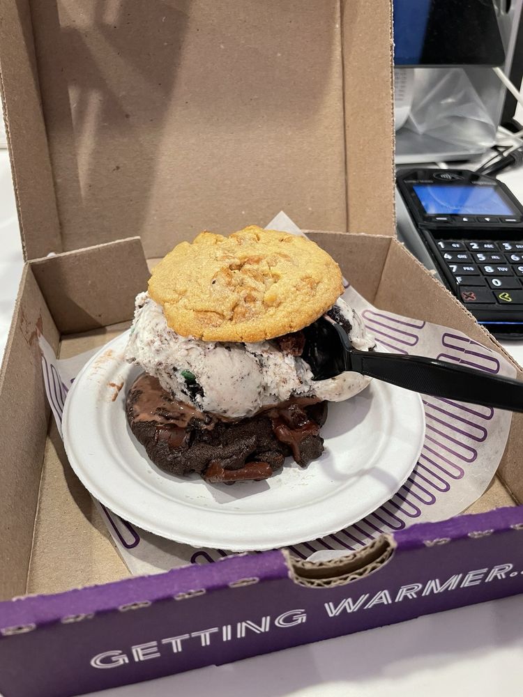 2 scoops of ice cream on a warm Chocolate Chip Brownie. Choose up to 3 ice cream flavors.